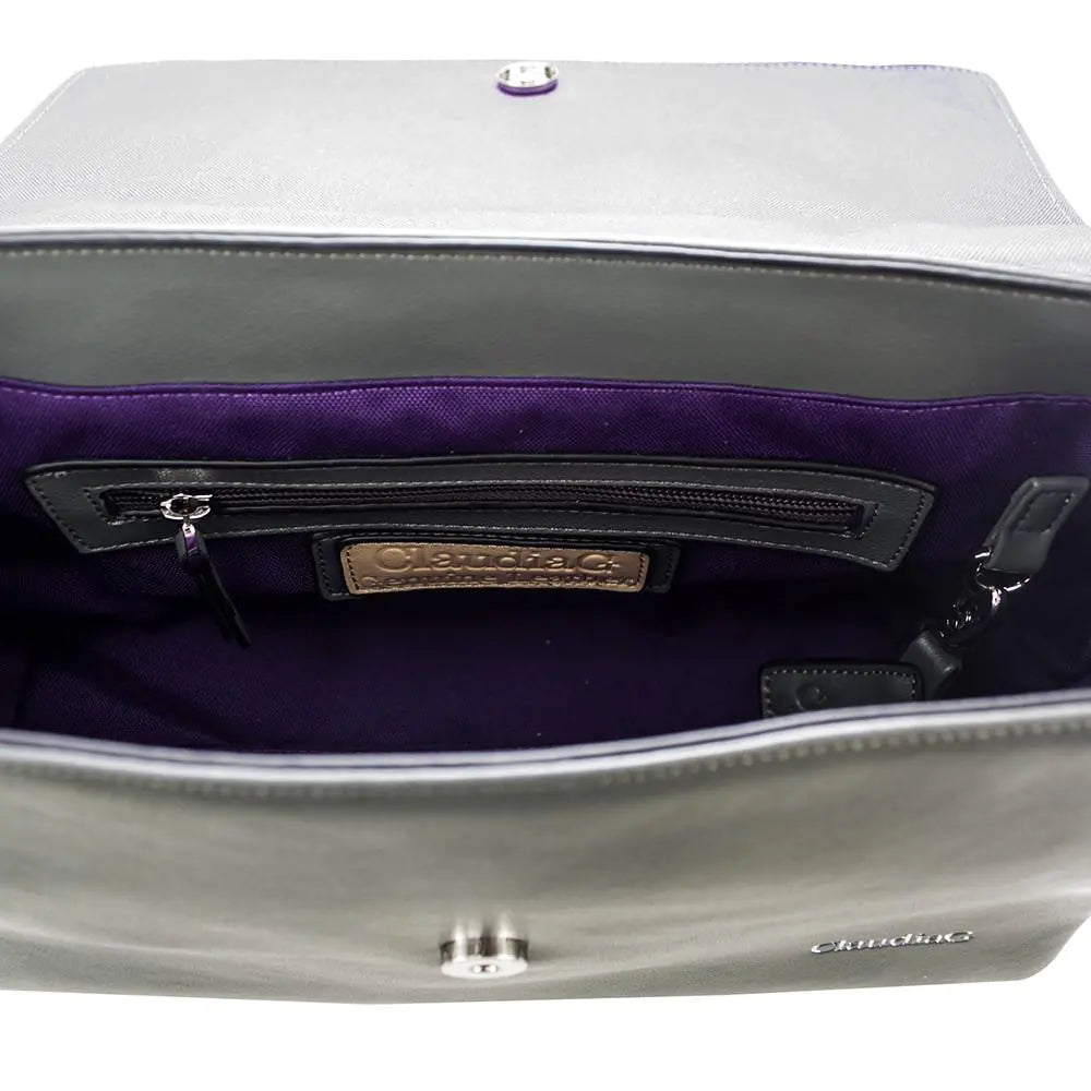 Simonetta is the classy every day handbag that can go with you anywhere you like. With a soft genuine leather body and suede flap in a contrasting color, this will be your every day bag this fall. Removable long strap. Purple interior lining with double pockets for your smart phone and spacious additional zipper pocket. Accented with removable ClaudiaG Drops.